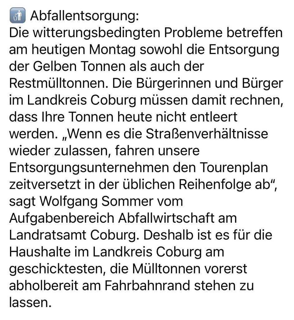 Die Abfallwirtschaft des Landkreises Coburg bittet, die Terminverschiebungen bei allen Abfalltonnen in der Weihnachtszeit zu beachten: